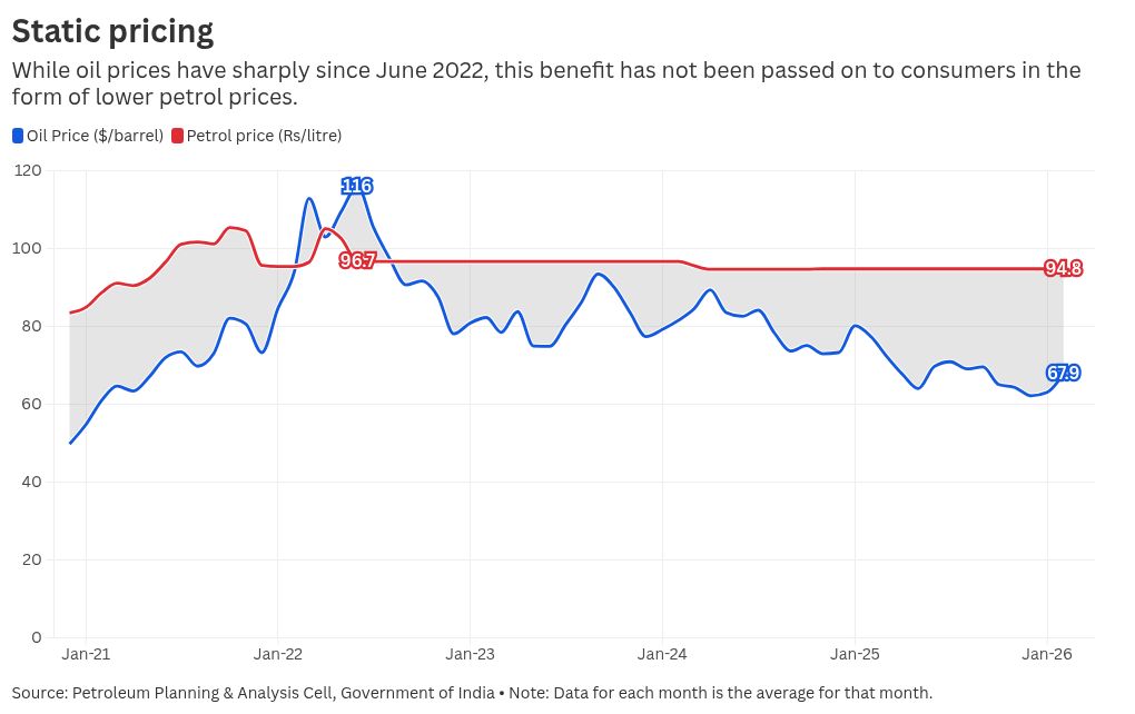 Oil prices rose to $116 a barrel by June 2022. Since then, however, the price of oil available to India for purchase has fallen to an average of $67.9 a barrel by February 2025, a 41.5% fall. During this period, the price of petrol sold in India was reduced from ₹96.7 a litre to ₹94.8 a litre, a 1.9% reduction.